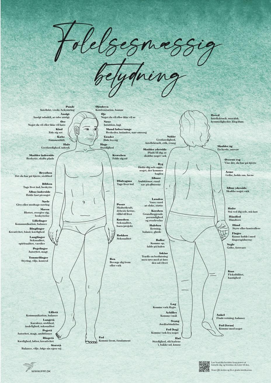 Plakat, som du kan have hængende i klinikken eller bare hos dig selv, med et overblik over betydning for en række af de mest almindelige placeringer på kroppen. A1 og A2 format.